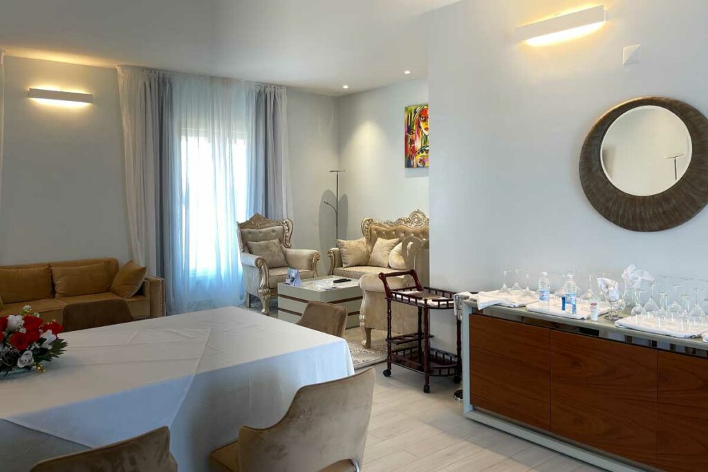 La suite présidentielle du RIBADOU offre le confort d’un luxueux appartement avec toutes les commodités pour un séjour agréable. Un grand séjour, trois (03) chambres spacieuses au lit King size, trois (03) salles de bains une ambiance chaleureuse propice au repos. Sentez-vous chez vous dans un cadre luxueux
